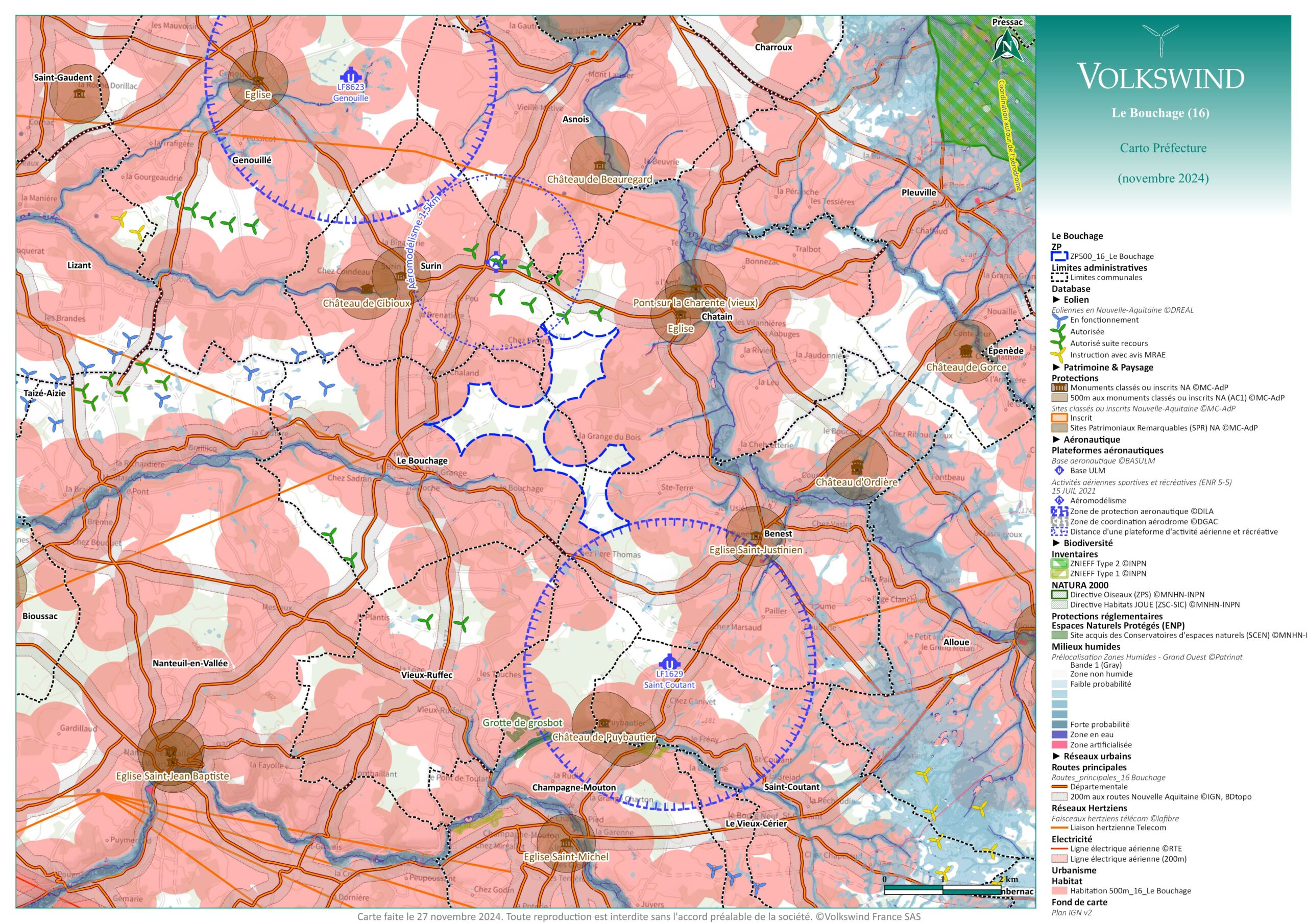 Cette partie du département de la Charente dispose de nombreux atouts pour développer une activité de production d’électricité d’origine éolienne. Le secteur d’étude se caractérise par des vents entre 6,5 et 7 m/s à 100 m ; ainsi qu’un faible nombre de contraintes aéronautiques. Ces éléments étant particulièrement propices pour le développement de projets éoliens.